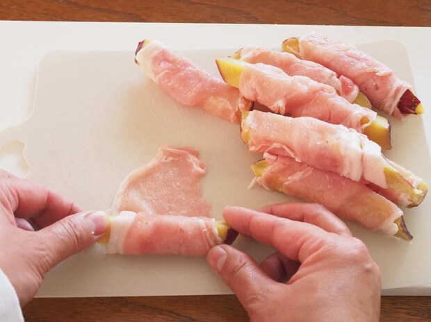 電子レンジで解凍したさつまいもを、豚肉でくるくる巻いていきます。スティック状なので巻きやすいのも魅力♪