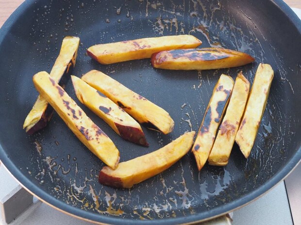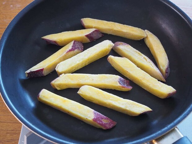 1品目はさつまいものバターしょうゆ焼きです。まず、凍ったままのさつまいもをフライパンに入れ、弱火でじっくり焼いていきます。