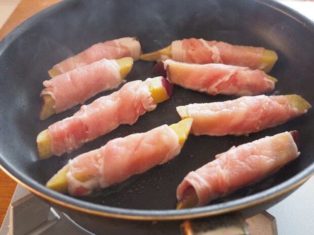 次に、フライパンに並べて加熱していきます。さつまいもには火が通っているので、豚肉だけ十分に加熱するだけでOKです。