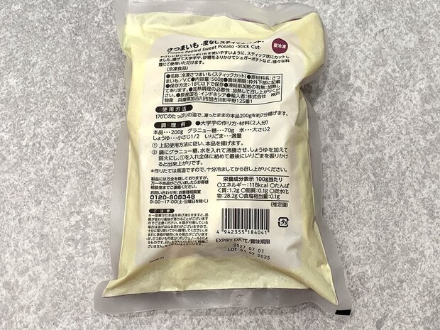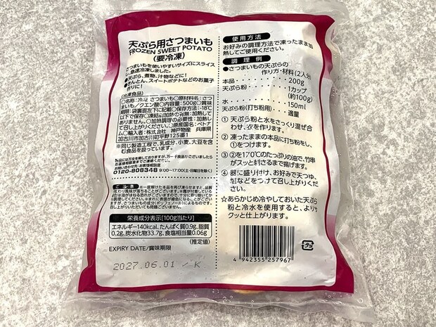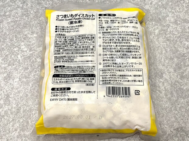 内容量は500gで価格は300円(税込)。パッケージの裏面には、さつまいもごはん・お粥・かき揚げ・コロッケ・サラダ・ポタージュなどさまざまな料理に活用できると書かれていますね。