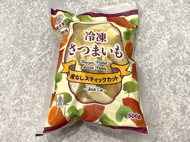 業務スーパーの冷凍食品でよく見かけるパッケージとは異なったデザインをしていますね。内容量は500gで価格は300円(税込)と、先ほどの皮ありのさつまいもスティックより少し安価です。