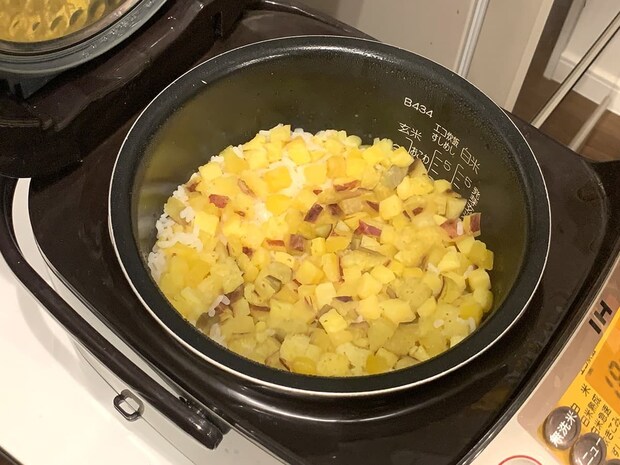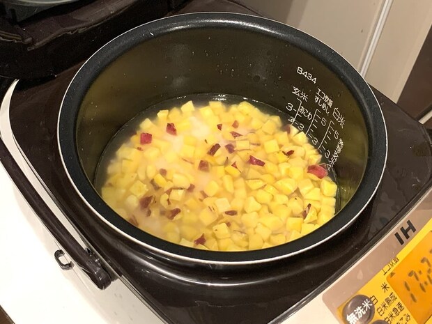 本品を使用し、さつまいもごはんを作ってみます。作り方はシンプルで、炊飯器にお米、水、みりん、料理酒、塩、さつまいもダイスカットを入れて炊飯するのみです。