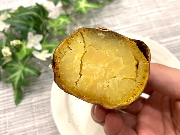 電子レンジで温めた焼き芋がこちら。皮の紫色が素朴さを感じさせる一方、中身はさつまいもらしい黄色でコントラストも魅力的です!