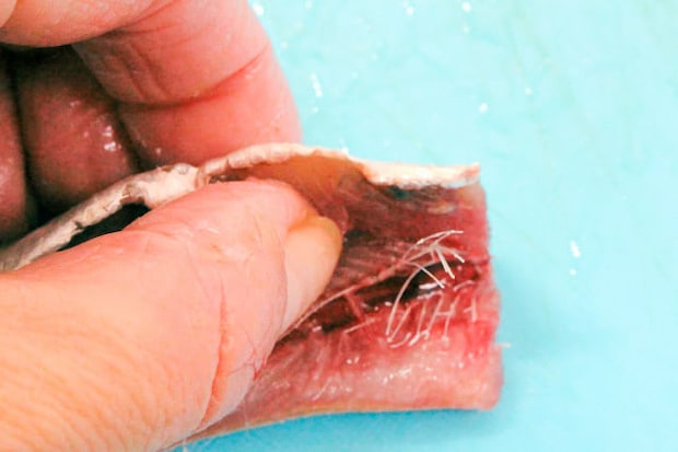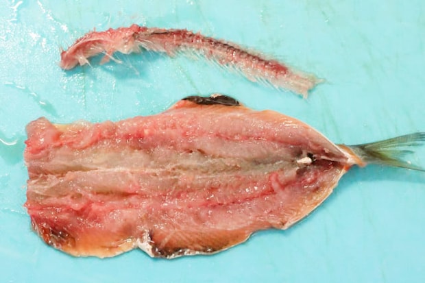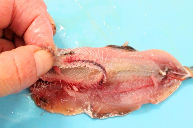 尾の付け根の骨を折って持ち、頭に向かって背骨を身からはがします。背骨はある程度の硬さがあるので途中で折れることなく、中骨と一緒にきれいに取れました。