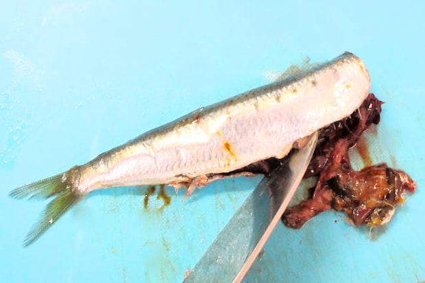 2. イワシの頭とわたを取り除き、よく洗って手開きにします。