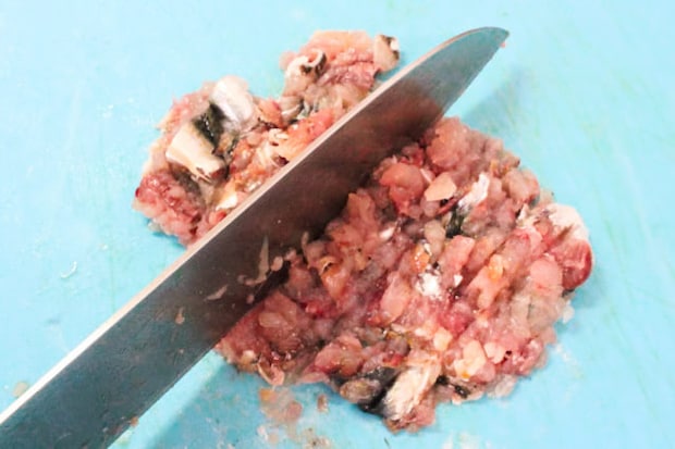 フードプロセッサーを持っていないので、今回は包丁でたたいてなめらかにしました。イワシ3尾だと身が少量なので、洗い物の手間を考えると包丁でも良さそうです。