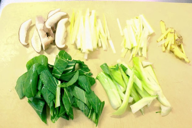 1. チンゲン菜を斜め切りに、軸を取り除いたしいたけを薄切りに、セロリ、長ねぎ、しょうがを千切りにします。