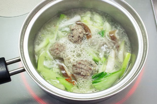 イワシのすり身を4等分にしてスプーンで丸め、煮立った汁に落とし入れました。