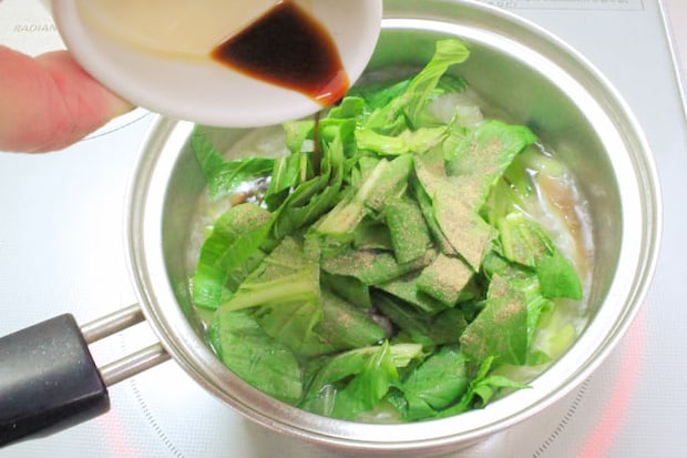 7. 1のチンゲン菜の葉、こしょう、しょうゆを加えて味を調え、仕上げに酢を加えます。