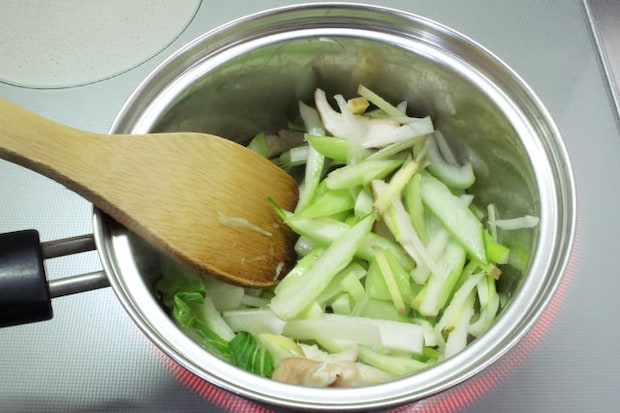 2分ほど炒めるとしょうがとセロリの香りが立ち、チンゲン菜の茎としいたけがしんなりとしました。水、酒、赤唐辛子を加えて2分ほど加熱しました。