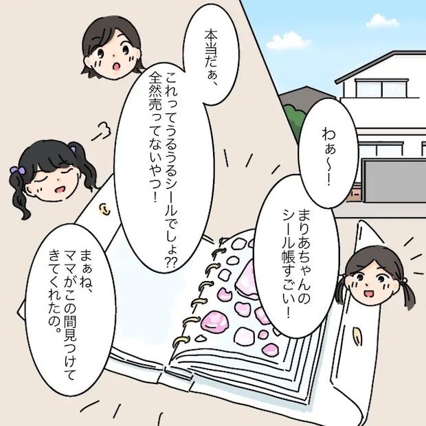 子どもたちは床にシール帳を広げると、「わぁ~!まりあちゃんのシール帳すごい!」「これってうるうるシールでしょ?全然売ってないやつ」と、まりあちゃんのシール帳を興味津々でのぞきます。2人に褒められたまりあちゃんは「まぁね、ママがこの間見つけてきてくれたの」と得意げに言いました。