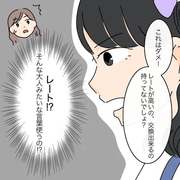 すると、まりあちゃんはムッとした表情で「これはダメ!レートが高いの!交換出来るの持ってないでしょ?」と言いました。レートって・・・そんな大人みたいな言葉使うの!?どうやら今のシール交換は、同じくらいの価値のもの同士でないと成立しないらしく、まりあちゃんが持っているうるうるシールはかなり希少なため、普通のシールでは交換してもらえないみたいでした。