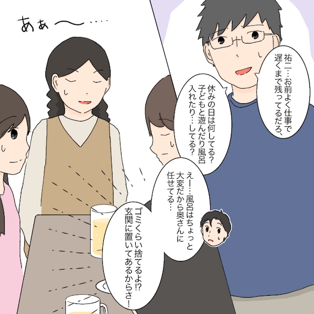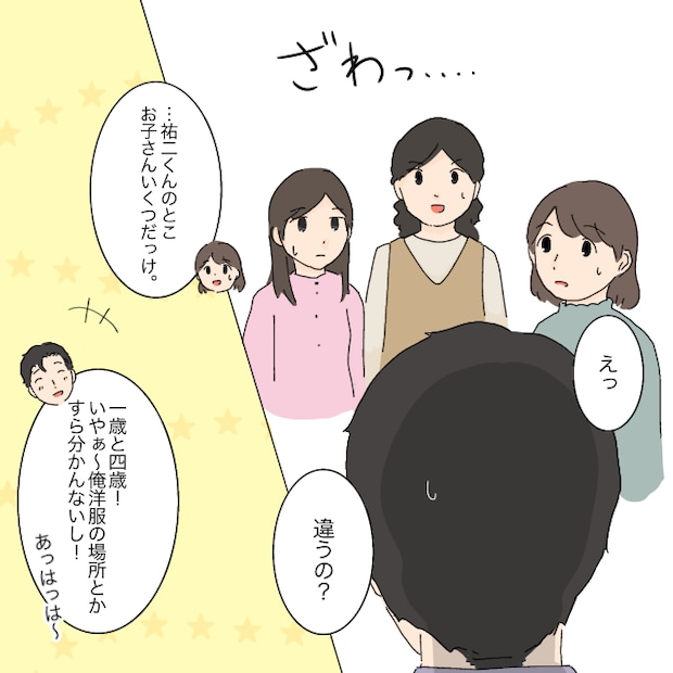 夫の発言に、その場の空気が一気にざわつきます。皆の視線が自分に集まっていることに気づいた夫は、戸惑った様子で「えっ、違うの?」と首をかしげました。そこへ1人の女性が「裕二くんのとこ、お子さんいくつだっけ?」とたずねます。夫は「1歳と4歳!いやぁ~俺、洋服の場所すら分かんないし!」と冗談めかして笑いました。