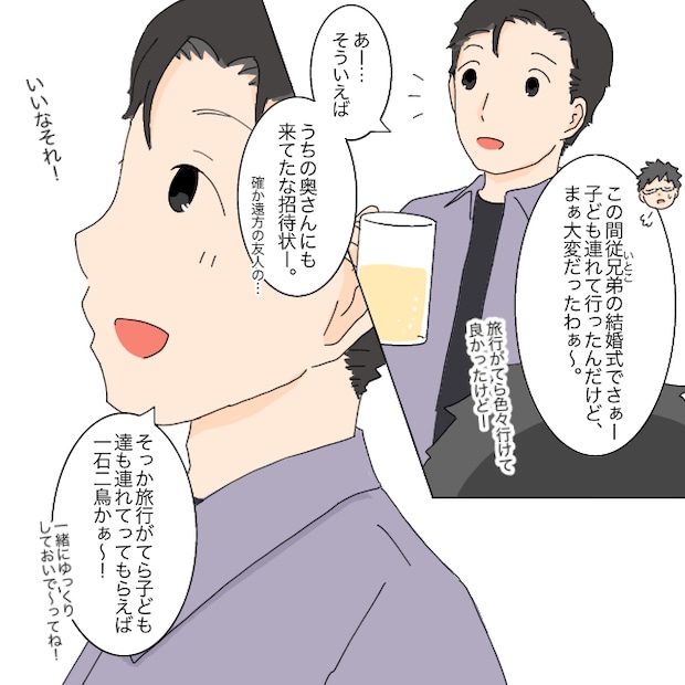 「この間、従兄弟の結婚式に子ども連れて行ったんだけど、大変だったわ」友人のその一言で、私宛に結婚式の招待状が届いていたことを思い出した夫。すると「そっか、旅行がてら子どもたちも連れてってもらえば一石二鳥かぁ~」と、とんでもないことを言い出しました。