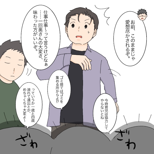 「お前、このままじゃ愛想尽かされるぞ」「仕事仕事って言うけどなぁ、1回奥さんの大変さを味わった方がいいぞ」「今時育児は協力してやらないとね」次々と浴びせられる正論に、夫は返す言葉もありません。周りの男性陣もうなずくばかりで、夫をかばう人は1人もいませんでした。