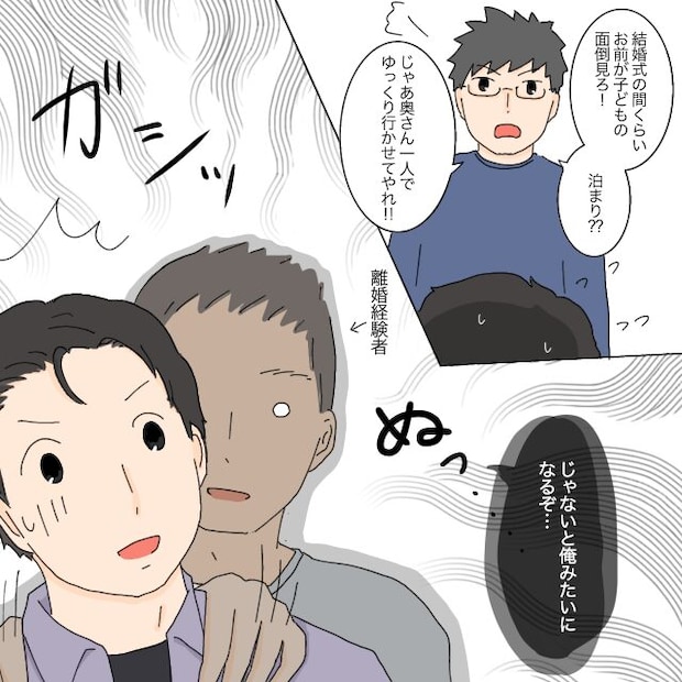 「結婚式の間くらいお前が子どもの面倒見ろ!泊まりならなおさら、奥さん1人でゆっくり行かせてやれ」友人からそう諭されてたじろいでいると、突然後ろからガシッと肩をつかまれ「じゃないと俺みたいになるぞ・・・」と離婚を経験した友人から言われました。
