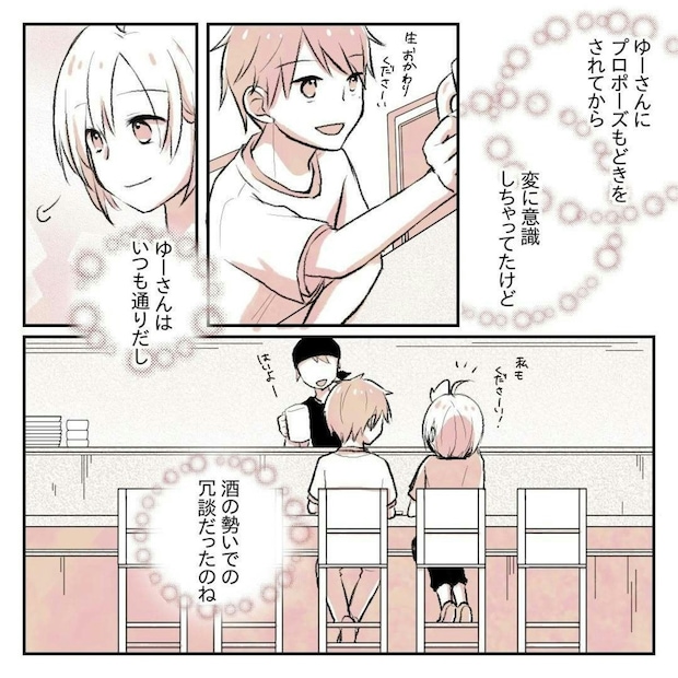 りんさんは、今日のゆーさんの雰囲気からあのプロポーズらしき言葉は冗談だったと思います。普段と変わらない彼を見て、意識しすぎていたのは自分だけだったと思ったのでしょうか。一方でゆーさんはりんさんのことをどう思っているのか気になりますね。