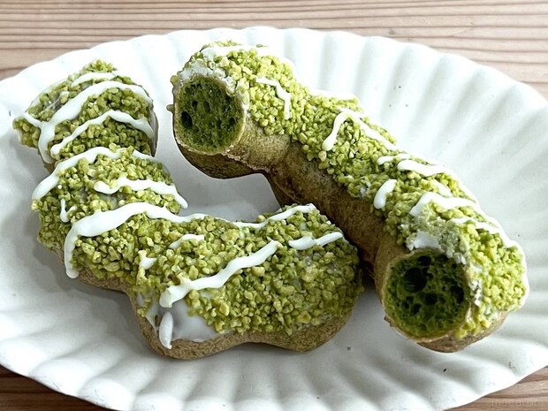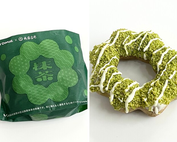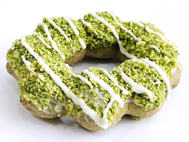 祇園辻利の宇治抹茶を練り込んだポン・デ・リング生地に、ホワイトチョコレートをコーティングしたドーナツ。宇治抹茶クランチもトッピングされています。