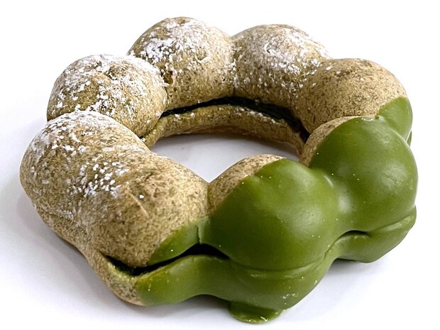 ポン・デ・リング生地に祇園辻利の宇治抹茶を練り込み、宇治抹茶チョコレートをかけたドーナツ。中には、北海道あずきあんと宇治抹茶わらびもちがサンドされています。