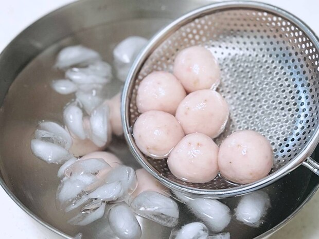 氷水にとって冷やし、水気をきれば完成です。ゆであずきや練乳をかけてお召し上がりください。