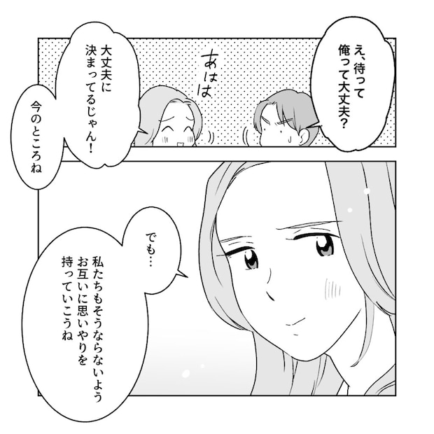 「俺って大丈夫?」と少し慌てたコウに「大丈夫に決まってるじゃん」と笑って答えた私。今のところはとても順調に、幸せな結婚生活を送っている私たち夫婦。将来義母のように熟年離婚なんてことにならないように、お互いに思いやりを持って行こうね、とコウに伝えました。