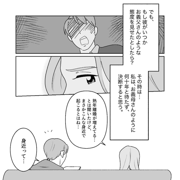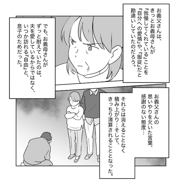 義母の家を訪れた時、突然の義母の離婚宣言に驚いたアイさんですが、夫コウさんも承知している様子です。義母とコウさんが話し合ってアイさんには会わせないよう、関わらせないようにしてきた義父とどういう経緯で離婚に至ったのか。アイさんは義母の長い離婚計画を知ることになります。義父は結婚してすぐから高圧的で傲慢なモラ夫に変わってしまいました。離婚や女性の自立に関しての仕組みや情報がまだあまりない時代、じっと耐えてきた専業主婦の義母でしたが、ある日離婚した友人から、離婚するつもりがあって、待てるのなら夫の退職金まで待った方が良いとアドバイスをもらった時に、義母は義父が退職するその日まで、自立の準備をしながら息子コウさんのために耐え抜こうと決心したのでした。それから15年経ち、義父の定年の日にとうとう義母は離婚を宣言しました。当然罵声を浴びせ、結婚を渋った義父でしたが、別居から離婚調停、長い月日をかけてとうとう離婚できたのでした。義母が幸せならそれでいいと微笑んだアイさんです。
