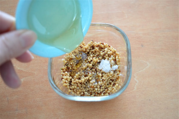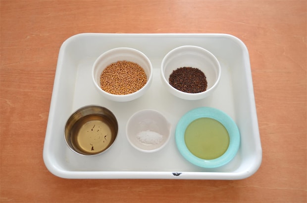 意外と材料はシンプルで、イエローとブラウンの2種類のマスタードシード、酢、蜂蜜、そして塩だけ。どれもスーパーで手に入る食材です。