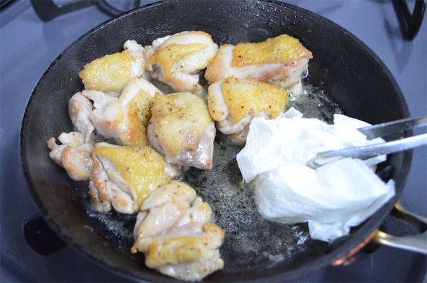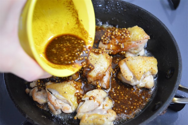 4. 鶏肉に火が通ったら、余分な油を軽く拭き取り、3を加える。弱火にしてソースがとろりとするまで1~2分煮絡める。