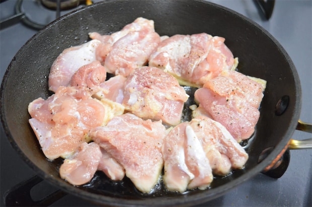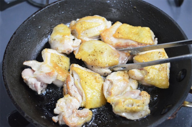2. フライパンにオリーブオイルを熱し、鶏肉を皮目から入れて焼く。皮がこんがりしたら裏返し、フタをして弱火で5~6分蒸し焼きにする。