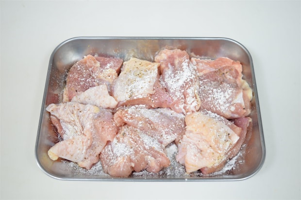 1. 鶏肉は一口大に切る。塩、粗びき黒こしょうをふり、薄力粉を薄くまぶす。