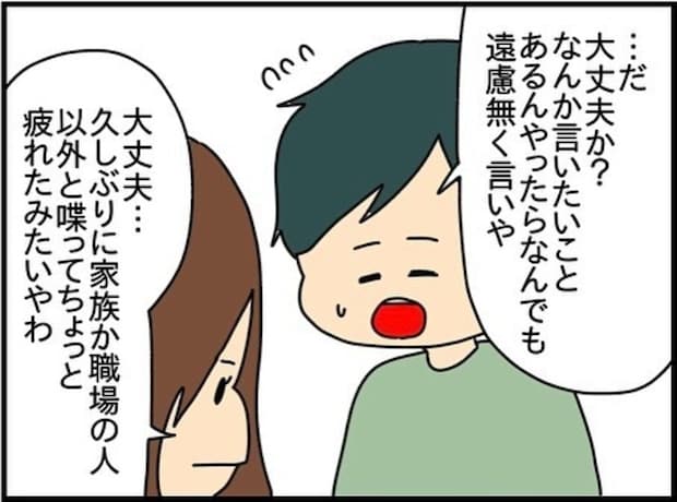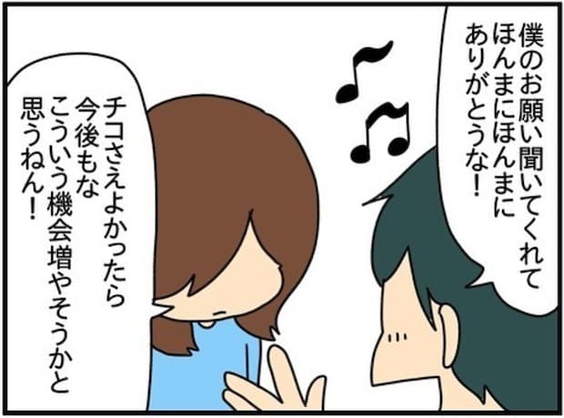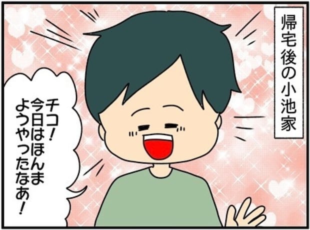 大谷家から帰宅し、夫はチコちゃんが今までのようなトラブルを起こさずに過ごせたことを喜びます。