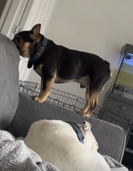 ソファの肘置きに立っている犬さんが