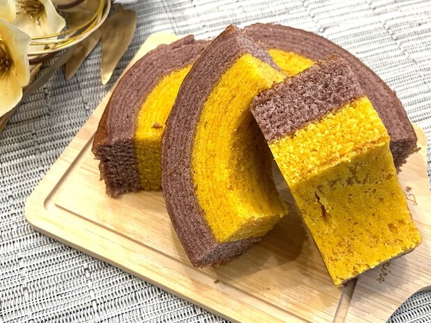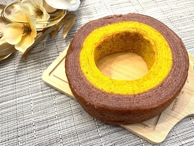 ホールのまま出してもパーティ映えするボリュームですし、カットしても断面がかぼちゃとむらさき芋の2層になっていて美しいバウムクーヘン。派手すぎない見た目で、ハロウィンにもぴったりですよ♪