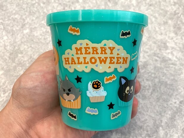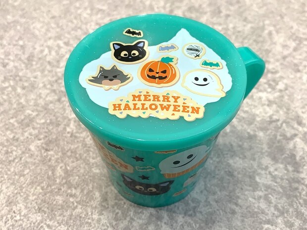 側面や蓋にはジャック・オー・ランタン、オバケ、クロネコなどが、子供でも親しみやすいデフォルメされたデザインで描かれています。今回はグリーンの商品を選択しましたが、他にもブルー・レッド・オレンジ・ピンクといったカラーのカップも売られていたので、子供の色の好みに合わせて購入できますよ!