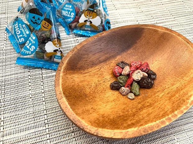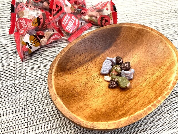 商品名に”ストーン”と入っている通り、小袋の中には小石に見立てたチョコレートが。ゴツゴツした形や不規則な色合いで、本当に地面から拾ってきた石のようですよね!
