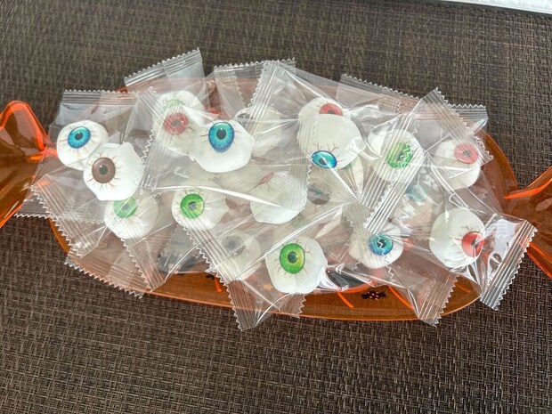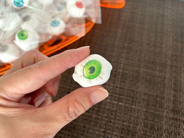 マシュマロは一口サイズで小さめ。青・緑・赤・茶などさまざまな色のめだまが入っており、不気味ながらもハロウィンの雰囲気を盛り上げる存在感があります!
