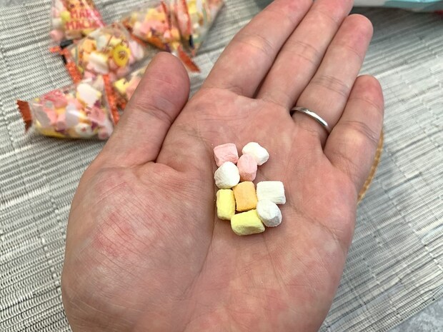 小袋の中にはホワイト・イエロー・ピンク・オレンジなどさまざまなカラーのマシュマロが入っていました。小さなキューブ状で、ハロウィン仕様のパッケージと合わせてワクワク感が一気に高まりますね♪