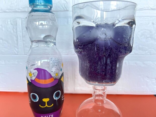 可愛いデザインなので瓶のまま飲んでも十分雰囲気を楽しめますが、スカルのコップがあったので注いでみることに。デザイン性のあるコップを使うだけで、また違った気分になれますね!
