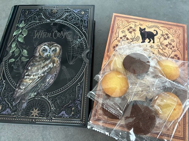クッキーを食べ切った後の缶はインテリアとして活用するのもおすすめ!シックな洋書デザインで、ハロウィン期間以外でも活躍しますよ♪