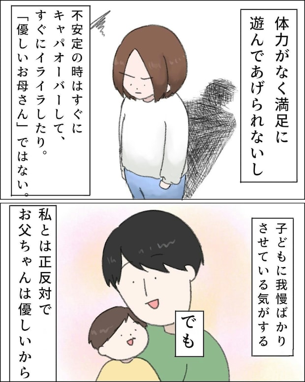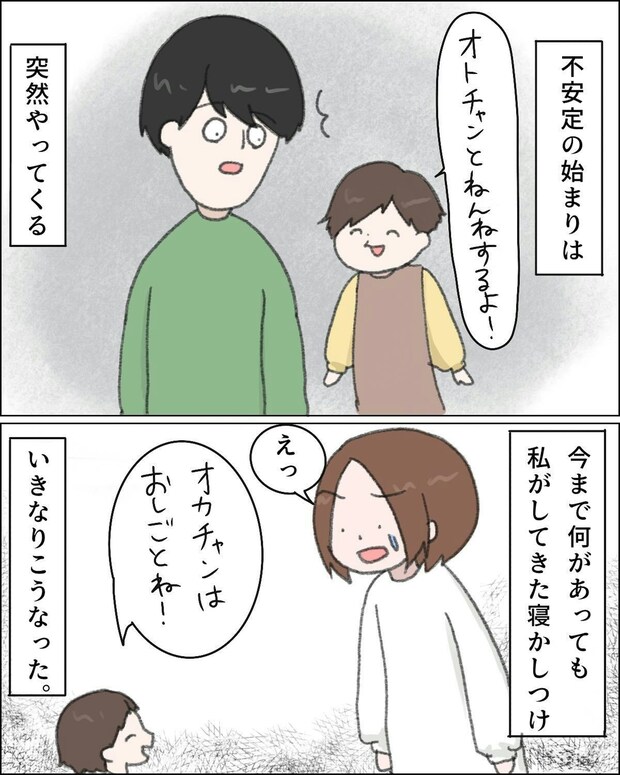 この作品の作者・ねむりひつじさんは、自己肯定感の低さから、不安定になると自己否定が止まらなくなってしまうことに悩んでいました。ある晩、いつも寝かしつけをしていた自分ではなく、息子のみぃくんが「お父さんがいい」と言い出します。その突然の出来事に動揺し、泣いて訴える姿を前に、ねむりひつじさんは一気に自分を責める気持ちに飲み込まれてしまいました。
