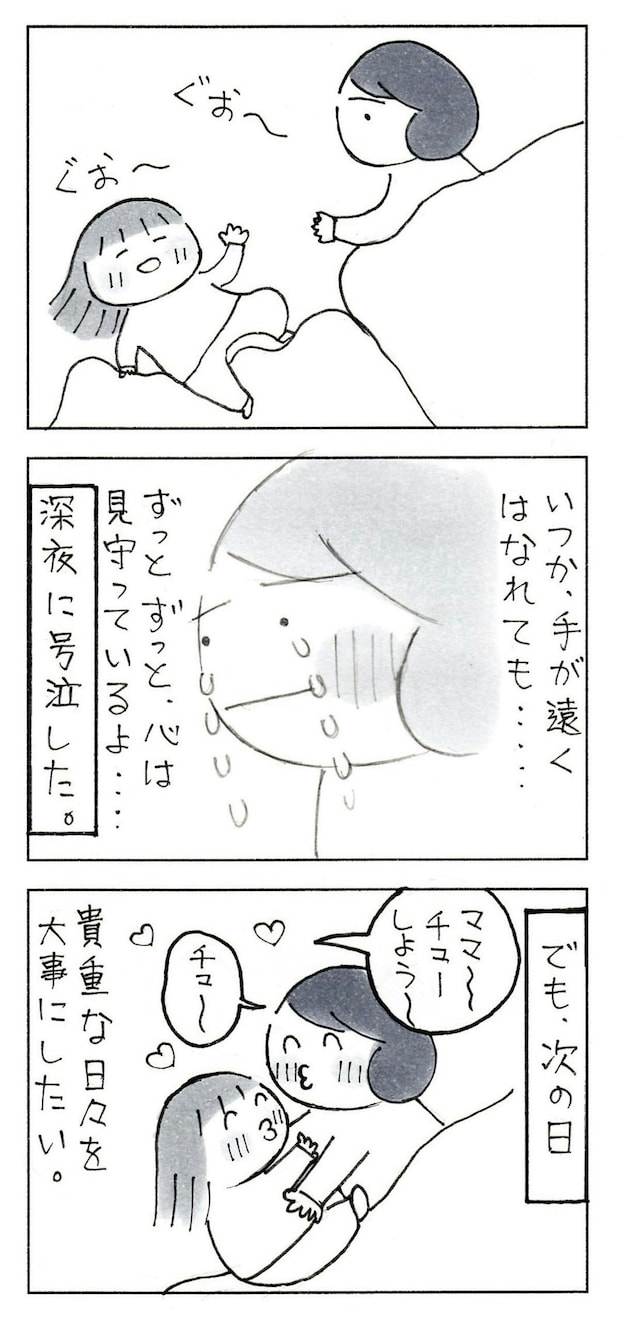 これは泣けますね。親として、子どもの成長をうれしく思う一方で、少しずつ手が離れていく寂しさに気づいてしまう瞬間…。それでも、たとえ手が離れても、心はいつまでもつながっている。そんな温かい気持ちになりました。
