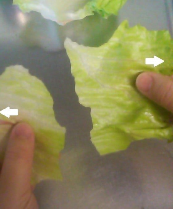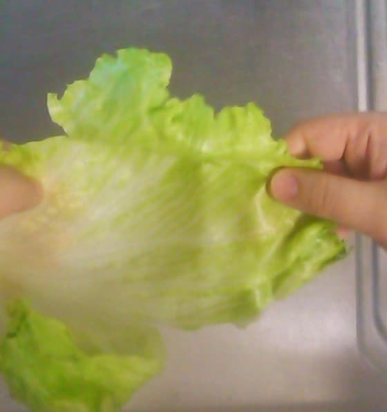 レタスをちぎるときは、レタスの繊維を平行になるように持ちます。