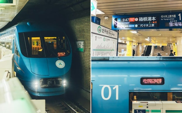 平日の「メトロはこね」は、北千住駅を9:47に出発。まだまだ通勤客が行き交うホームにゆっくりと入線してくるブルーの特急列車に、ちょっとした特別感を味わいながら乗車
