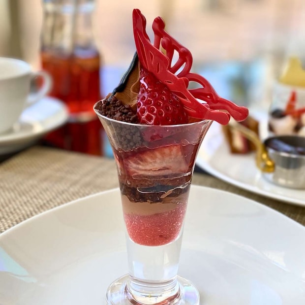 蝶のチョコレートを添えて。多彩な層が織りなす華やかなパフェ