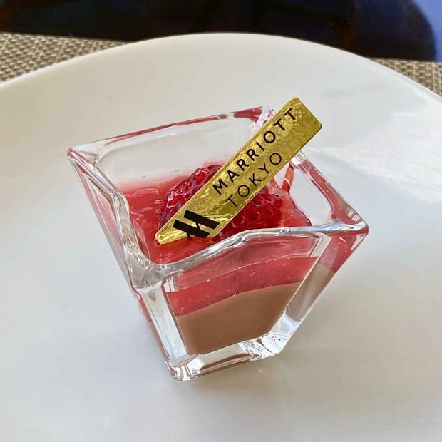 上層のジュレには、カカオの果肉部分であるカカオパルプのピューレにクランベリーをプラス。ほどよい酸味の中に、カカオの繊細な香りがほんのりと感じられます。カカオを余すことなく使うというシェフのこだわりが反映されており、カカオ豆からチョコレートを手がけるマリオットホテルならではの一皿だと実感しました。