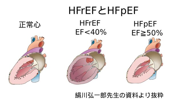 HFrEFは心不全全体の約6割を占める中心的存在でした(2004~2005年の研究より)。ところが、2011~2015年の研究では、HFrEFは4割以下になり、代わってHFpEFが心不全全体の半数近くを占めるほどに増えてきました。心臓がどんどん大きくなるHFrEFとは全くタイプが異なり、HFpEFでは左心室が広がらなくなった結果、心臓の中の圧力が上がりやすくなり肺に血液がうっ滞する主症状がみられます。