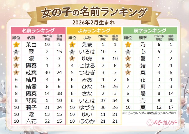 2026年2月生まれ 女の子に人気の名前ランキング|ベビーカレンダー月間名前ランキング調べ
