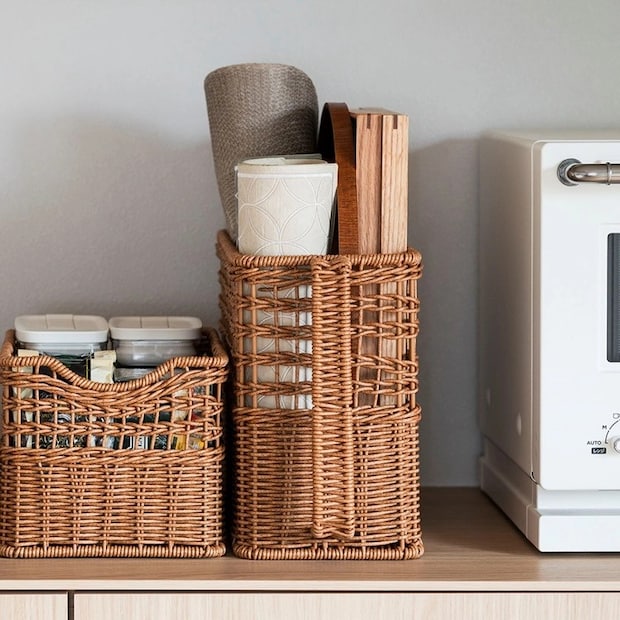 樹脂製のPP(ポリプロピレン)でできているラタ調の収納ボックス。ナチュラルな風合いがまるで天然素材のような仕上がりに。人工ラタンだから汚れてもサッと洗えるのでいつでも清潔に保てます。キッチンやリビング、湿気が気になるバスルームやランドリースペースなどでも使えますよ。