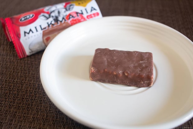 中身を取り出してみると、ミルクチョコレートの甘い香りがします。ブラックサンダーと比べると、少し幅が広め。