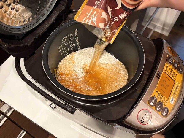 研いだお米2合に本品をそのまま入れるだけで、水の計量すら不要という至れり尽くせりの仕様です。